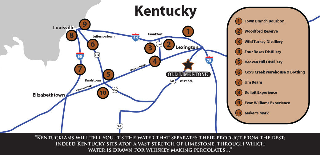 This is the same delicious, velvety-smooth water used by master distillers in Kentucky to make your favorite bourbons. It delivers a rich mouthfeel and it amplifies the taste and aroma of your favorite brand, never alters it. Old Limestone is drawn from the Kentucky limestone aquifer. These unique spring waters have traces of calcium and magnesium in them, which gently bring out bourbon nuanced flavors, but no iron, which would turn a bourbon mash black. Even in Kentucky, ordinary tap water falls short of what a master distiller needs. Old Limestone. 100% limestone-filtered spring water. Ships world wide from Kentucky.